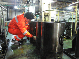 某疏浚公司是我国从事沿海港口和航道疏浚工程的骨干企业,该公司在上海港区作业的一条自航耙吸挖泥船,泥舱容量9000方,设备维持24小时连续运转。其功率/转速为3000kw/1000rpm的自航主机使用180#重质燃料油,工况相对苛刻,过去一直使用进口润滑油。2008年10月该公司采用SINOPEC润滑油与进口润滑油进行比对试验,两台自航主机中的2号主机换用SINOPEC 4040船用中速发动机润滑油,1号主机仍使用进口油品。其间,先后进行了3次吊缸检查,在该主机上成功使用7000小时后进行的吊缸检查结果表明:SINOPEC船用油与进口润滑油品质相当。因此,该船主机决定从此全部使用SINOPEC 4040。另外,燃烧4号燃料、型号为8DS32的泥泵发动机也换上了SINOPEC 4012船用中速发动机润滑油,使用至今设备运行良好,经受住了负荷变化大,承载性能要求高以及有可能混入海水的考验。
