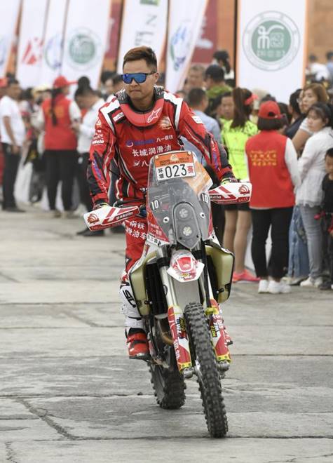 (图:八一钢铁长城润滑油车队车手王雲骑车亮相发车仪式)